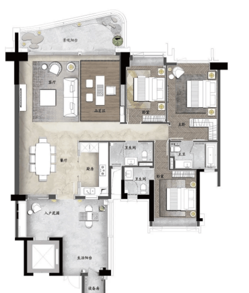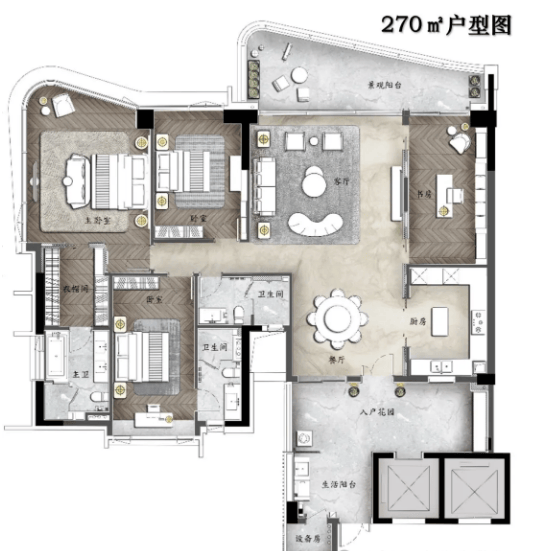 高层洋房方面,主要在售R6-R9栋,均为现楼交付,豪华装修标准,省去业主装修繁琐流程。在售户型面积区间为140㎡-270㎡,均为四房双主套设计,4梯3户配置,3.3米层高,空间开阔、采光通风俱佳,每一户都能享受良好的景观视野。其中140㎡为南向园景大宅,超高性价比,三卧室朝南设计,独立电梯入户,同享两千万豪宅交标配置;200㎡为一线°环幕三江视野,独立电梯入户,多功能入户花园,简约半开放式厨房,阔绰双主套房设计;270㎡为王牌环幕江景四房,约9米超大邮轮式阳台,一线望江无遮挡,专梯专户,墅级空中双花园,约28㎡超大私家庭院,约42㎡超大主卧空间,尊享高端居住体验。
