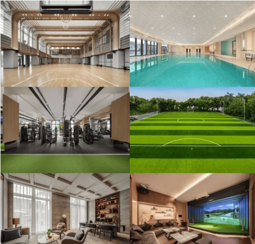 运动配套方面,项目打造了运动设施超60%占比的高标准专业体育俱乐部——天CLUB,由亚洲飞人苏炳添担任首席荣誉官,以会员制打造自然健康圈层生活平台[3]。天CLUB以下沉式庭院的规划进行打造,共有地上两层、地下一层合计三层的设计,内部配套齐全,涵盖开放式开敞明亮的图书馆、室内外儿童乐园、室外花园泳池、室内恒温泳池、室内多功能综合球馆、乒乓球室、健身房、虚拟高尔夫、茶室等设施场地,满足业主运动健身、休闲阅读、亲子互动、圈层社交等多种需求[3]。